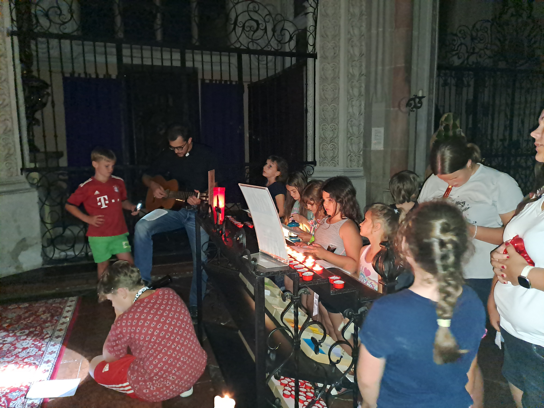 Gemeinsames Kochen und Grillen standen genauso am Programm wie jede Menge Spaß und Spiele, singen und Filme schauen und - schließlich auch ein nächtlicher Besuch in der Kirche und Gang auf den Kirchturm, um aus luftiger Höhe einen Blick auf die schön beleuchtete Stadt werfen zu können. Kerzen anzünden und Abendgebet beschlossen den Tag, bevor im Pfarrsaal sich jede und jeder ein Plätzchen zum Schlafen suchte.