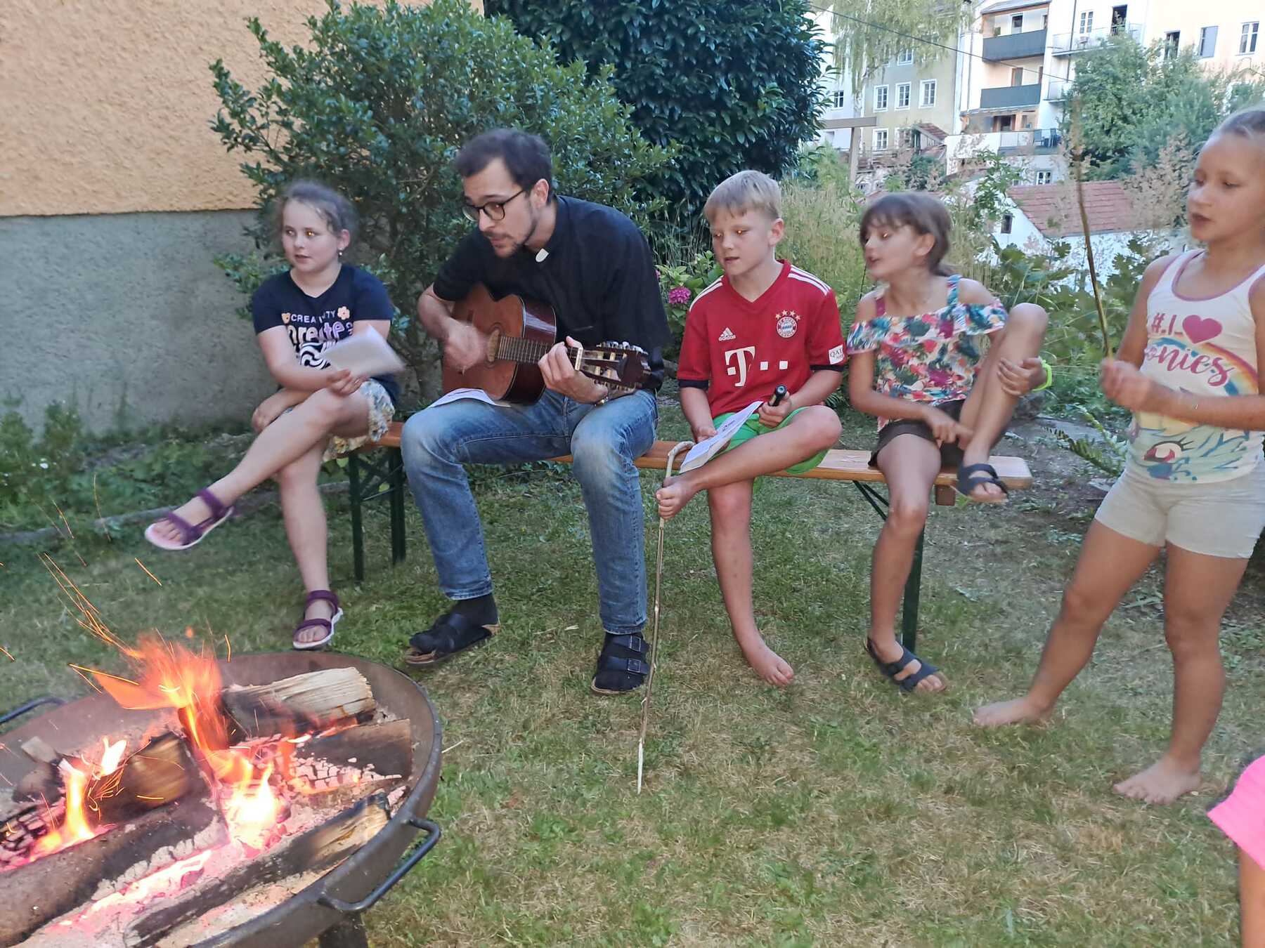 MinistrantInnen (und solche, die es noch werden wollen) der Pfarrgemeinden Maria Königin und St. Stephan trafen sich Ende Juni zu einem Sommerfest mit Übernachtung im Pfarrsaal im Pfarrheim St. Stephan. Kaplan Philipp, Cornelia Lauschmann und Matea Sekerija hatten sich für die Minis sehr viel einfallen lassen: